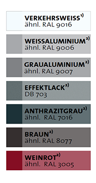 - Türen in allen abgebildeten ähnl. 7 Trendfarben, einfarbig innen und außen zum gleichen Preis (2-farbig - außen: eine der 7 Trendfarben; innen: RAL 9016 weiß - gegen Aufpreis)